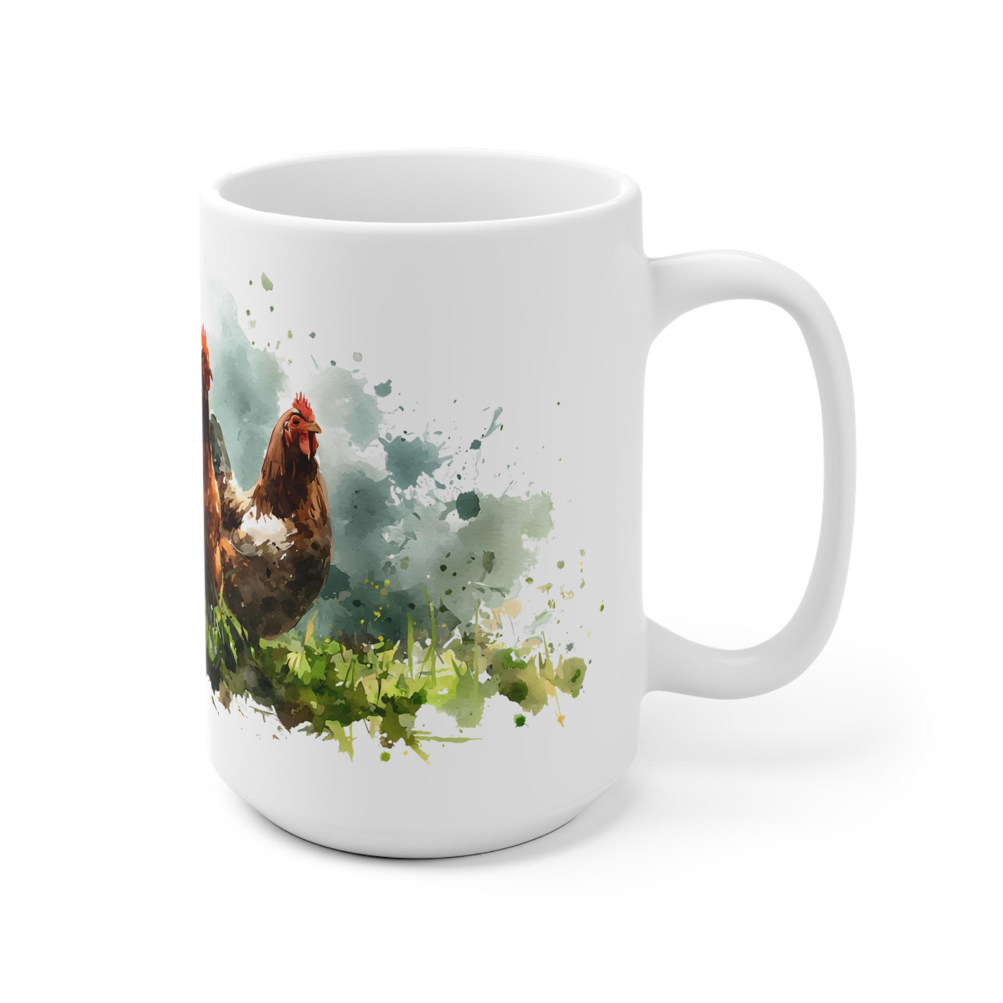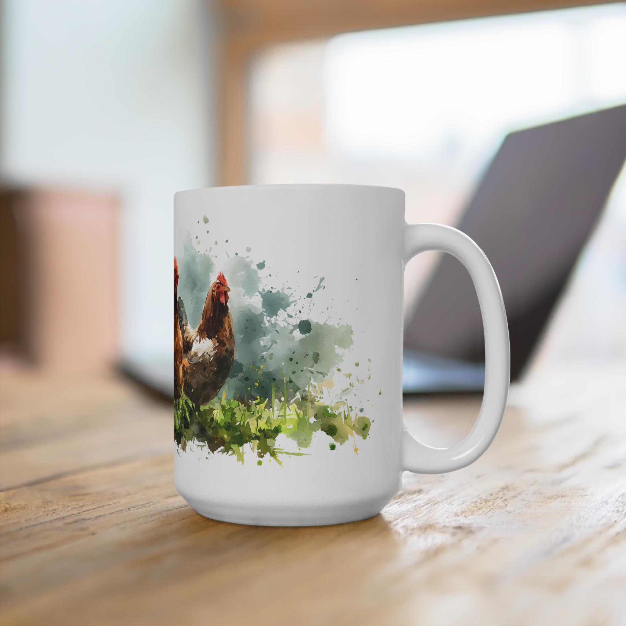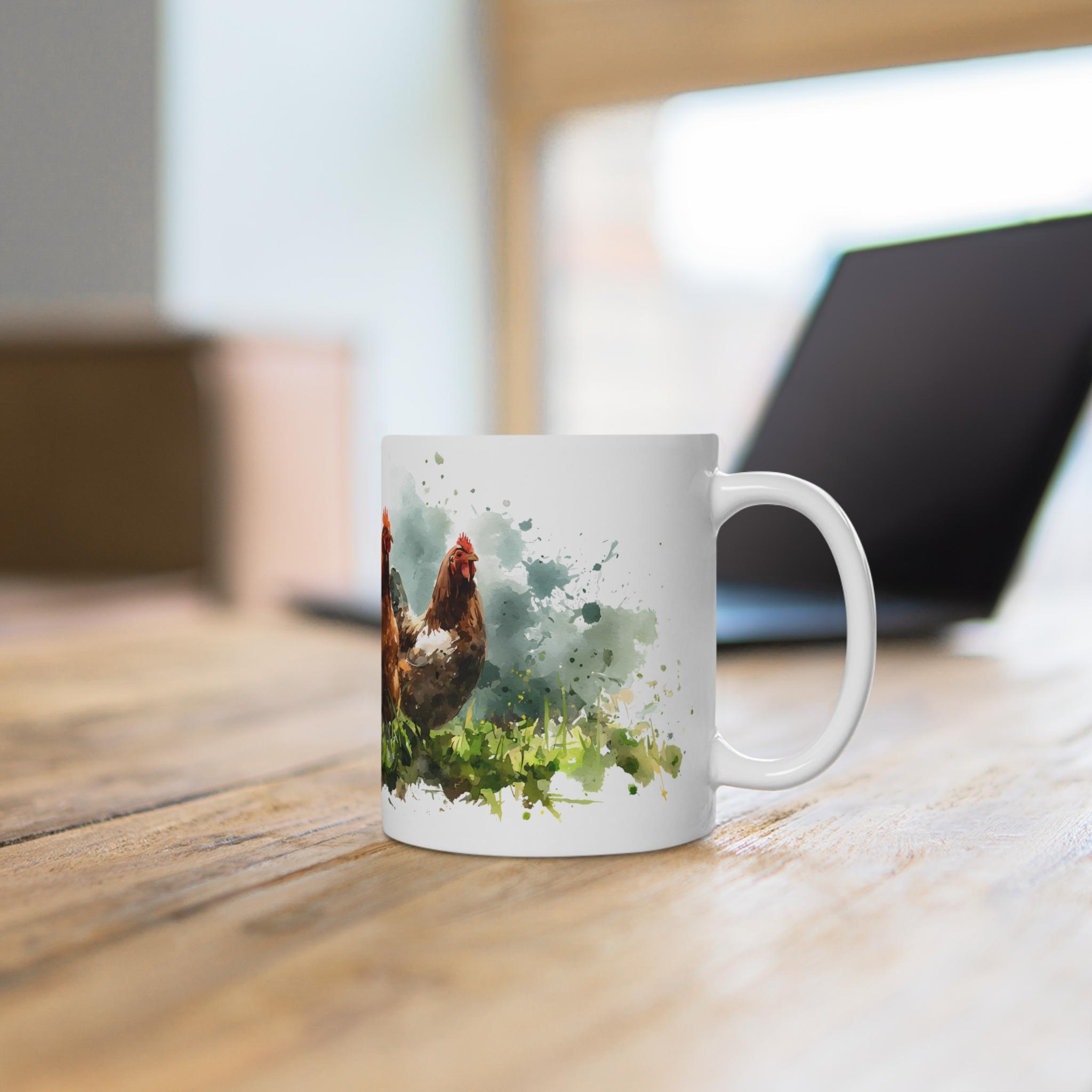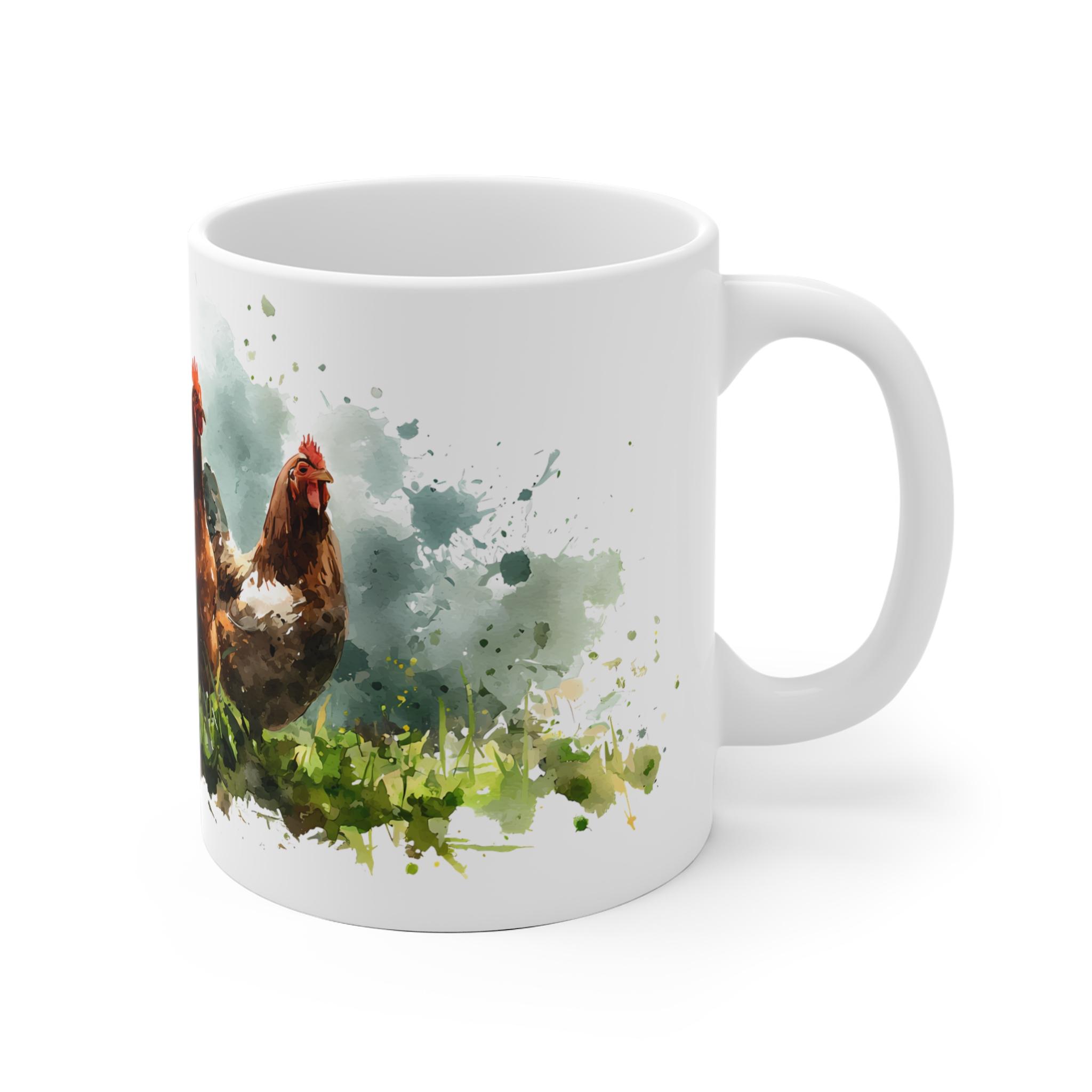 Die exquisite Hühner Aquarell Tasse präsentiert eine lebendige Darstellung einer Bauernhof Hühnergruppe in atemberaubender Aquarellkunst. Diese Tasse ist ein Muss für Liebhaber von Hühnern und einzigartigen Kunstmotiven. Mit ihrer lebendigen Farbgebung und detaillierten Gestaltung bringt sie den Charme des Landlebens direkt in Ihre Küche. Die Tassen sind in zwei praktischen Größen erhältlich: 11 oz und 15 oz, sodass sie sich perfekt für Ihren Morgenkaffee oder Nachmittagstee eignen. Die hochwertige Keramik sorgt für Langlebigkeit und Robustheit, während die kunstvolle Gestaltung auf der Tasse ein echter Hingucker ist. Ob als Geschenk für einen Tierliebhaber oder zur Bereicherung Ihrer eigenen Sammlung, diese Tasse vereint Funktionalität und künstlerische Eleganz auf wunderbare Weise. Genießen Sie Ihre Lieblingsgetränke mit einem Hauch von Kunst und Natur. Der Preis liegt zwischen 18,00 € und 20,00 €, ein unschlagbares Angebot für ein solches Kunstwerk.
