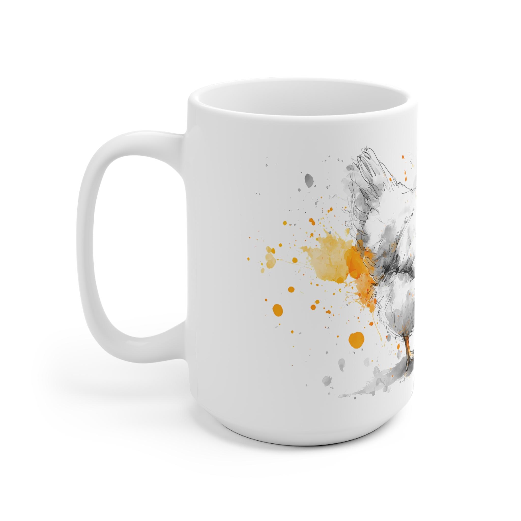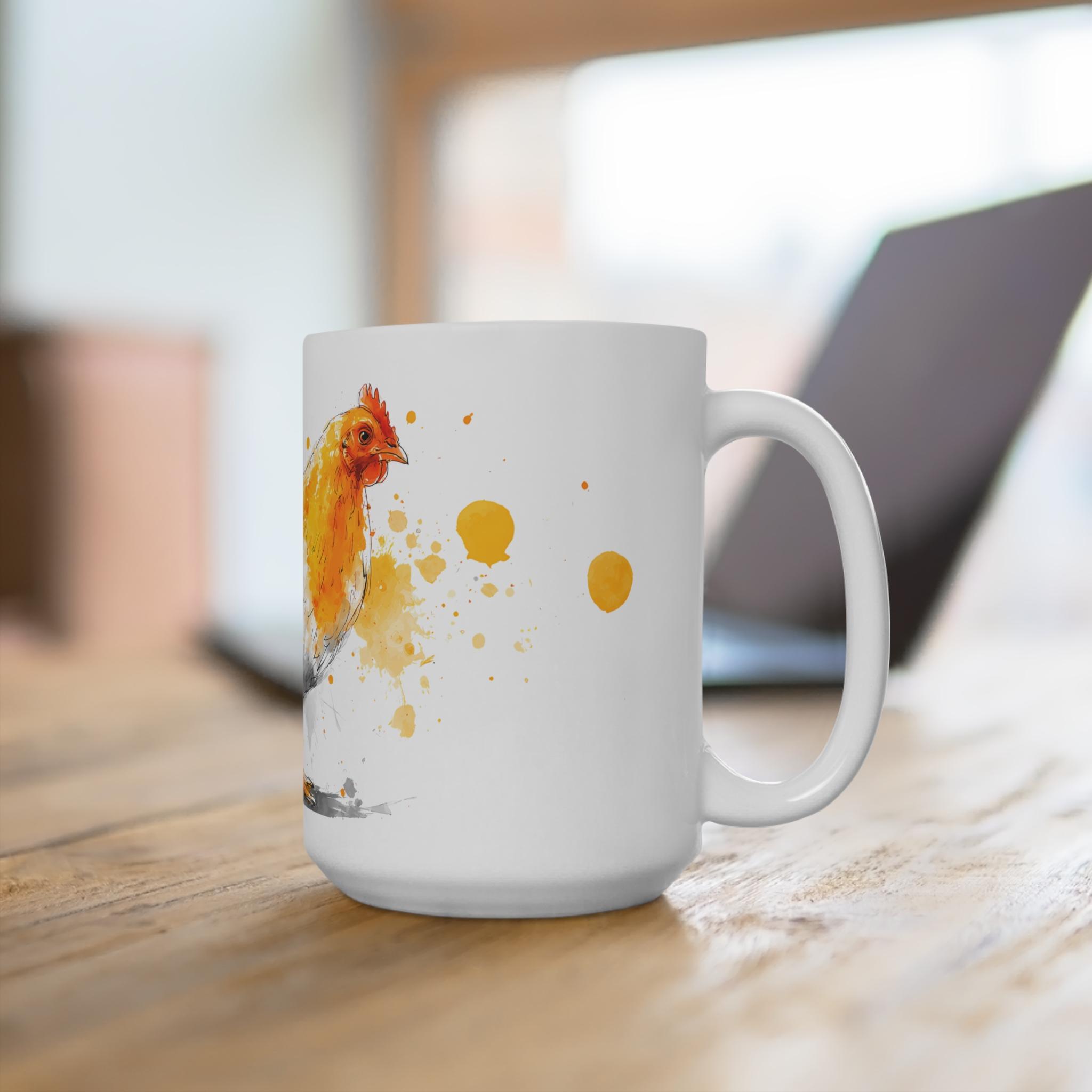Die Huhn Aquarell Tasse präsentiert ein elegantes weißes Huhn mit lebhaften gelben Farbspritzern in moderner Aquarellkunst. Erhältlich in den Größen 11 oz und 15 oz, vereint sie Ästhetik mit Funktionalität und ist ideal für Tierliebhaber und Kunstenthusiasten. Preis: 18,00 € – 20,00 €.
