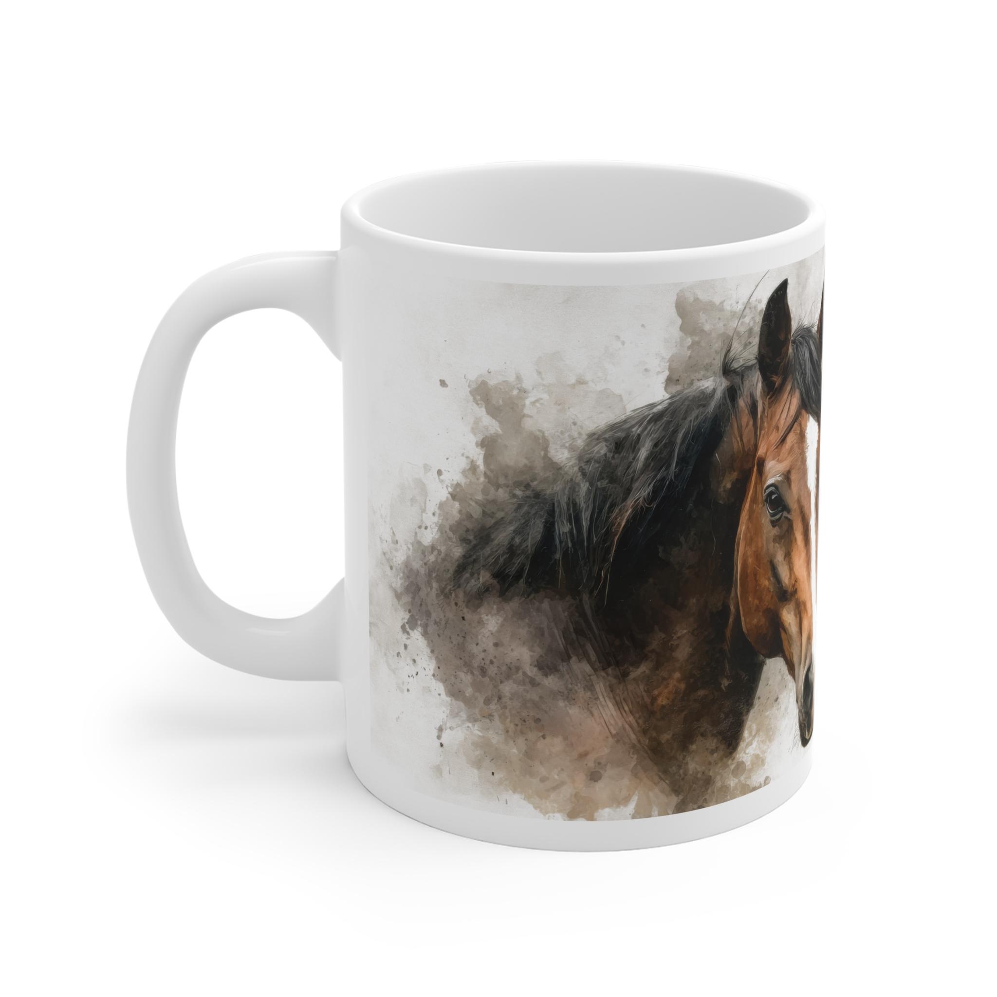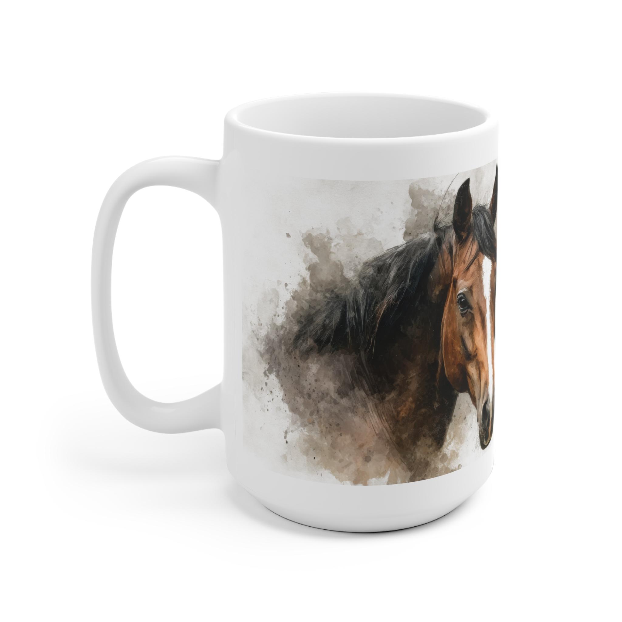 Elegante Tasse mit hochwertigem Aquarell-Porträt eines braunen Pferdes, ideal für Reiter und Pferdeliebhaber. In 11 oz und 15 oz erhältlich, vereint sie stilvolles Design und praktische Alltagstauglichkeit.