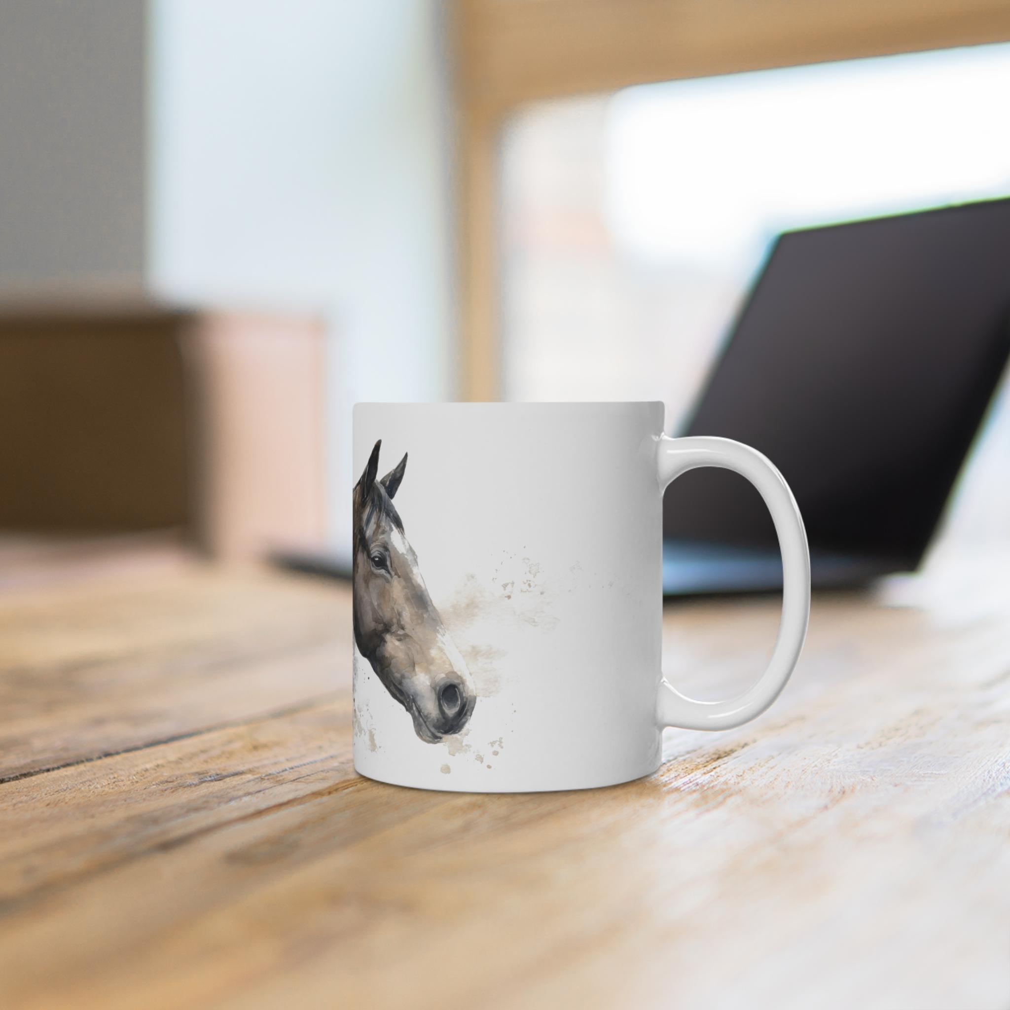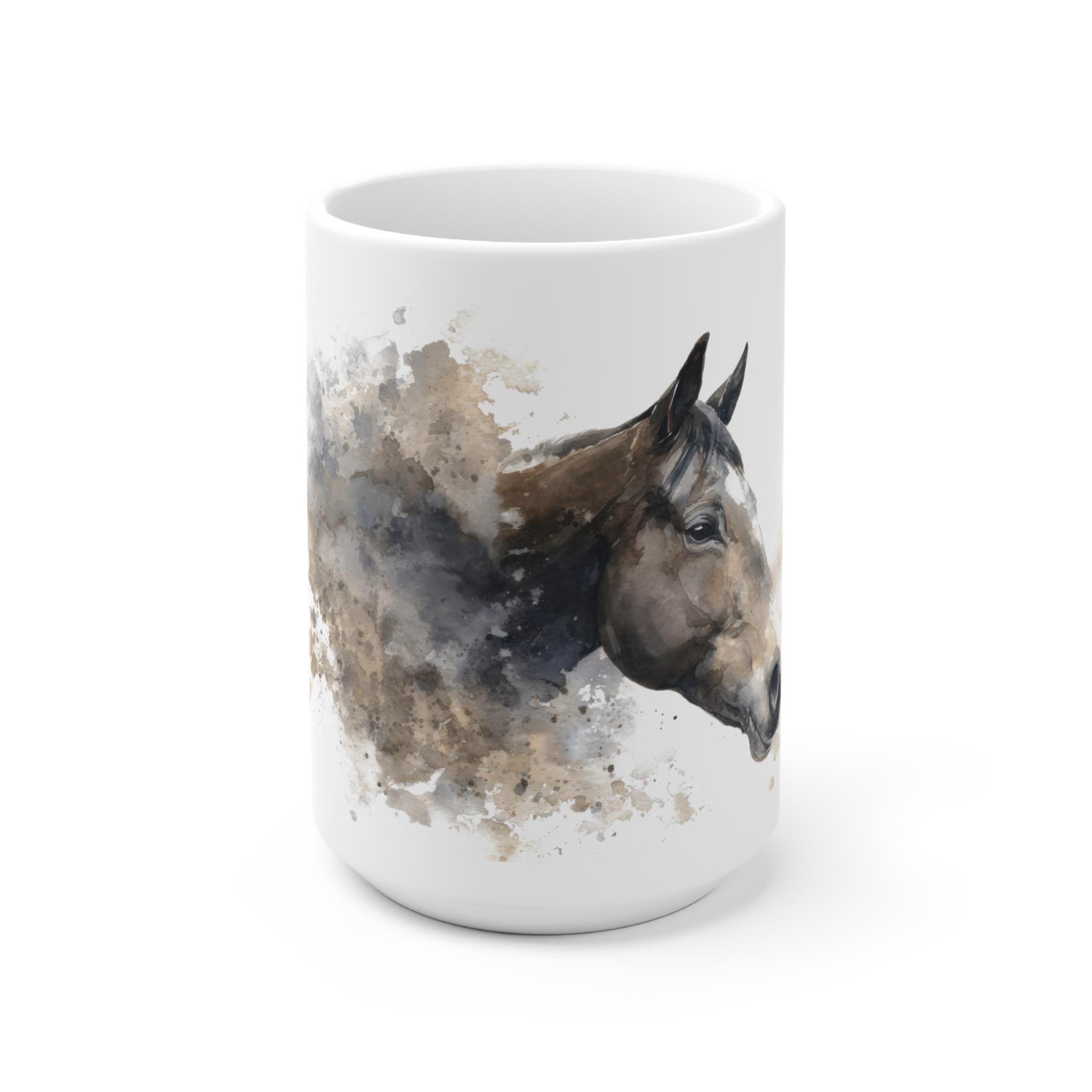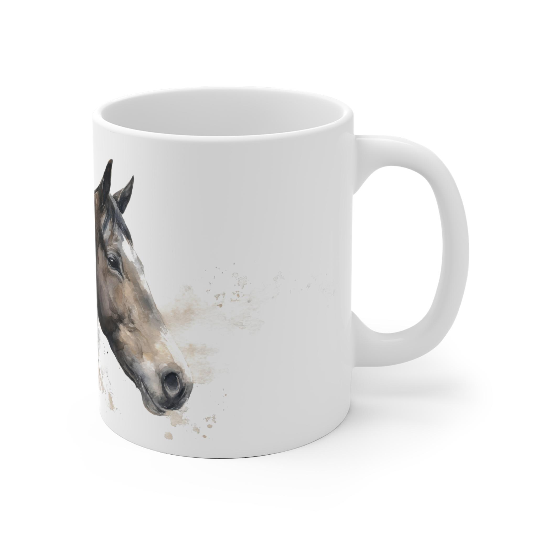 Diese elegante Tasse mit hochwertigem Aquarell-Pferdeportrait ist ideal für Pferdeliebhaber. Erhältlich in 11 oz und 15 oz, überzeugt sie durch zeitloses Design und brillante Druckqualität für den stilvollen Kaffeegenuss.