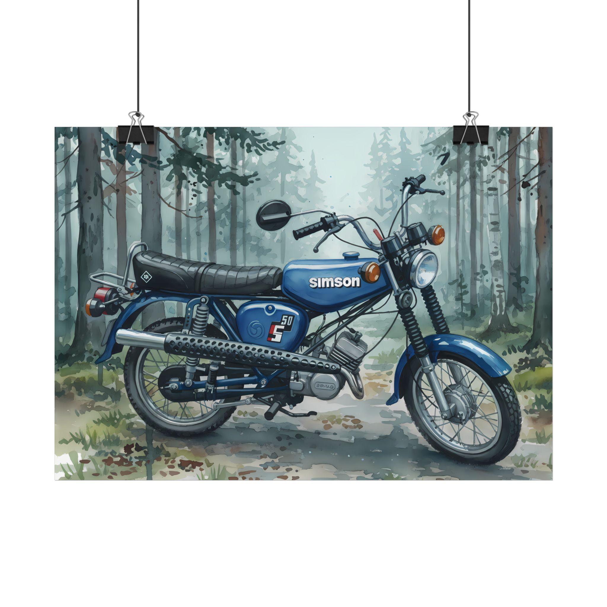 Erleben Sie nostalgisches Design mit dem Simson S50 Aquarell Poster, das das ikonische DDR-Kult-Moped in einem stimmungsvollen Waldmotiv zeigt. Dieses hochwertige Kunstdruck-Poster verbindet klassische Fahrzeugästhetik mit künstlerischer Aquarelltechnik und eignet sich ideal zur stilvollen Wanddekoration für Liebhaber historischer Mopeds und DDR-Kultur.