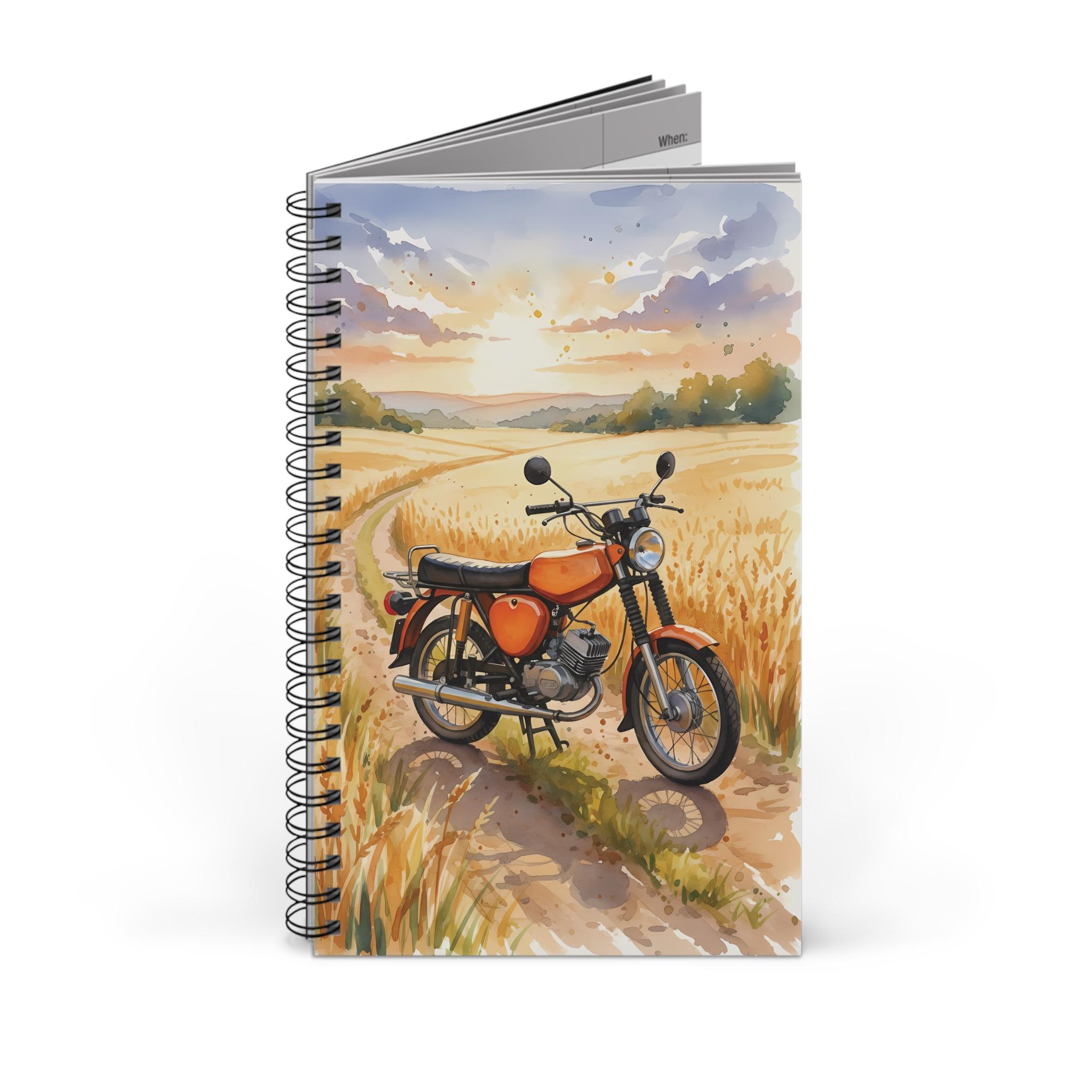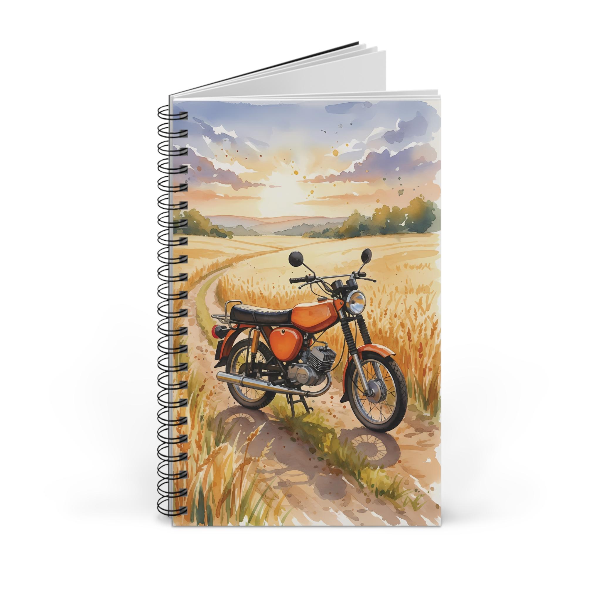 Dieses Ringbuch-Notizbuch zeigt die Simson S51 als stimmungsvolles Aquarellmotiv in einer weiten Feldlandschaft bei warmem Abendlicht. Die harmonische Farbgebung, der offene Horizont und die detailreiche Darstellung des Kult-Mopeds vermitteln Freiheit, Ruhe und nostalgisches Fahrgefühl.
